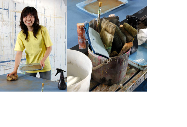 テーマパークやお店、レストラン、ホテルの壁や天井にだまし絵や模様などが描いてあるのを見たことはないでしょうか。これはエージングと呼ばれる時間の経過を表現することで空間をつくりあげる仕事です。鉄をサビさせたり、壁を汚れた感じや割れた感じにしたり、お店のイメージに合わせてエージングをおこなうのが「フォーペインター」の仕事です。